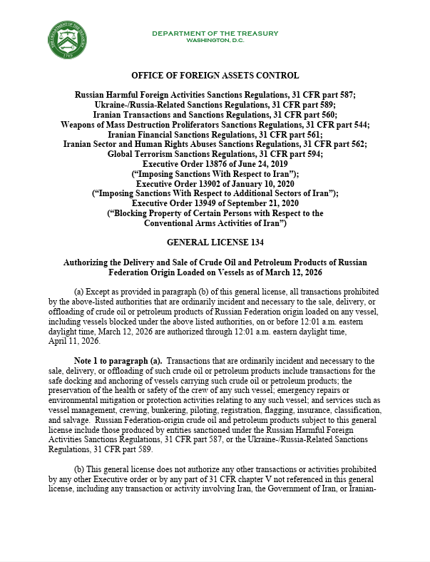 Il Dipartimento del Tesoro ha revocato le sanzioni sul petrolio russo attualmente in mare, consentendone la spedizione agli acquirenti di tutto il mondo, mentre Trump si affanna a contenere l'impennata dei prezzi dell'energia, legata alla sua guerra con l'Iran.