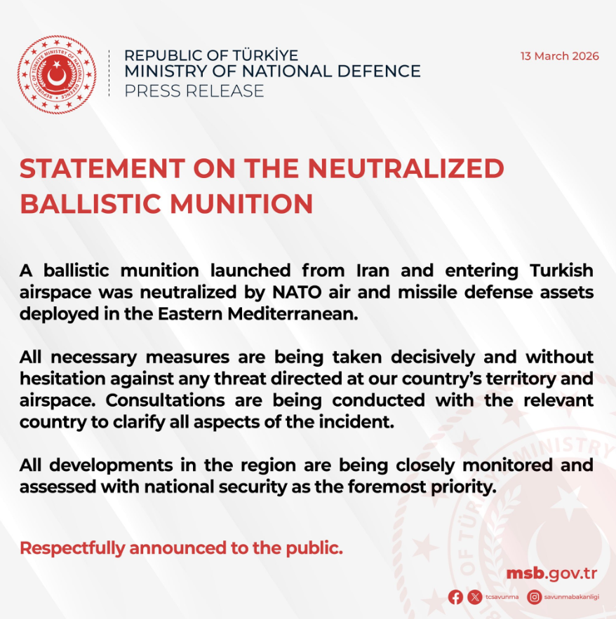 Il Ministero della Difesa della Turchia ha annunciato che un missile balistico lanciato dall’Iran e diretto nello spazio aereo turco è stata intercettato e neutralizzato dalle difese aeree e missilistiche della NATO nel Mediterraneo orientale. Ankara ha dichiarato di aver avviato consultazioni con il Paese coinvolto e di monitorare attentamente la situazione per la sicurezza nazionale. Si tratta del terzo episodio del genere in pochi giorni dall'inizio del conflitto in Iran.