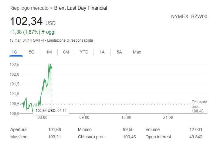 Anche la decisione di revocare temporaneamente il divieto di vendita del petrolio russo in mare non sembra aver calmato i mercati, con il Brent che ora si trova stabilmente oltre quota 100.
