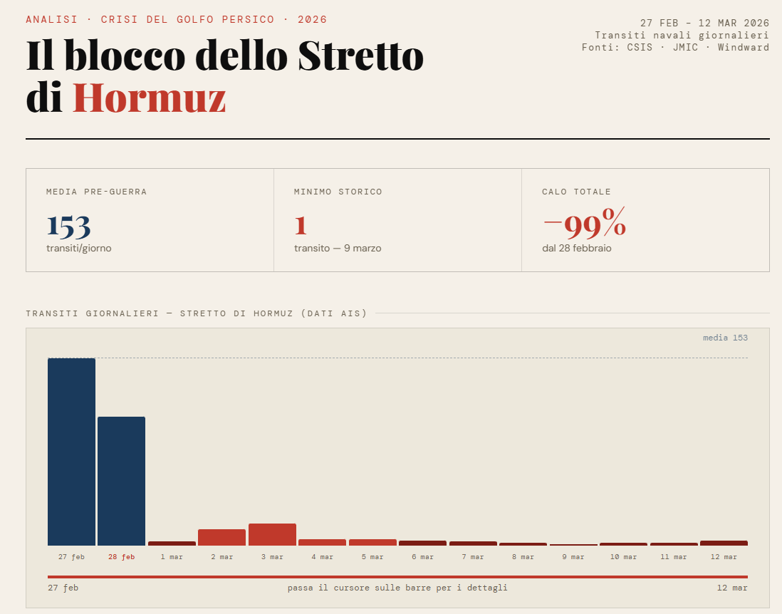 Infografica - il blocco dello Stretto di Hormuz, impatto sui transiti navali giornalieri